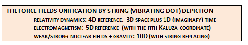The cosmology may, possibly, resort to the ‹natural laws›, if absolute ‹information› consent running the extant ‹universe›. Einstein prospected using the space-time 4D reference, to describe the astral dynamics. Lately, force fields unification (Figure 5), suggested widening to the Kaluza-Klein 10D reference, to include all the presently modelled physical interactions. The 3D geometry is needed: lower dimension cannot consent stable orbits, under central forces. Kaluza found that the general relativity equations, written in 5D, require a further condition: the electro-magnetism. The 10D extension is subsequent model, with the string’s guess to smooth away gravity inconsistencies. The 1D time is interpreted bending the geometry; the 6D (hidden) dimensions are out of any visual restitutions, when performed, just, using polar lines-of-sight.37–41