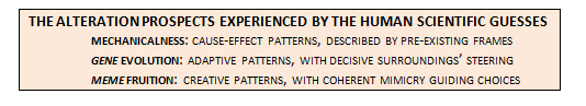 The received dualism does not assume axiomatic backing (not proved). In lieu of ‹truth›, ‹contingency› is reached, besides, establishing additions at the intangible synthetic by-product range. A plain cue reveals it: the ‹mind› ripens by ‹communication›, i.e., interpersonal formats. The conceived pieces of knowledge and agreed behaviours are intangible crafts, at provisional worth, varying on the shared span. Due to dualism, anyway, the mind sphere is free from deterministic cogency, because pertaining to abstract domains, not ‹matter› embedded, but expressed after interactive bargain, if intelligence is accepted singularity. This way, the mind/spirit worlds develop by meme courses: they follow clashing tracks, which add to the gene ones. That dualism presumes distinct paths: in the matter one, through which the ‹surround fitness› plays central roles; in the intellect the other, at meme deployments. Moreover, both are contingency upshots, more than (upper driven or inborn deterministic) absolute outcomes. Definitely: the adaptive fitness operates as the issue of genome alterations, ending in modified offspring, in which fitting specimens have bigger chance to survive and to proliferate. The ‹natural selection› is typical contingency result: it addresses new met stable outfits, ex tempore obtained by gene variations, in the average, yielding to adapted progeny. In parallel, the enhanced talent clans distinguish by relational effectiveness, after mimicry contest and step-up opting. The meme course is totally occurring at the intangible level; it is alternative to the transcendental driving and in contrast with the deterministic setting. But, the received dualism expressly goes this way.56-61