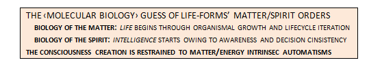 Today, face to the global ecology perils, the question ‹can spirituality safe the civilisation?› is posed, to contrast the ‹biology of the spirit›, the awkward track, hinted after the genome reading, as absolute truth. The ‹biology› labels the steps bringing to generate self-reproduction entities, from the synthesis of peculiar amino-acids, through joining of DNA-like suites and cell organisation singling out. The ‹cognition› tags are used to specify the relational virtues, created by men, from the children tutoring, to the home-and-market running and to the governance fashioning. ‹Intelligence› is not after-effect of ‹life›. The rational orderliness follows methodology (rather than ontology) departure from entropy trends: occurrences, such as ‹life› or ‹intelligence› are singularities (not needing proofs), followed by genomic and relational upshots; processes, such as the recalled, widen the ‹actuality› by intangibles, promoting agentive and rational issues.73-77
