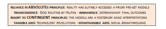 The ‹relational› talent develops at the mutual range. In the drawn scheme, meme fruition follows gene evolution, once the human babies are trained to fulfil basic acts by language, trade, legality, etc. tools. The communal spheres are obviously limited at the parental, clan, town, nation, etc. spans, but the reaches are factual upshots, with abstract weight, at intangible range. The scale factors play biasing effects, maybe, by shaping the minds: e.g., the political scope exploits country’s patriotism, to establish inner glue vs. external rampart. In principle, the posterior contingency, today, fully replaces the a priori absolutism (Figure 9). Yet, in the previous survey, the mechanicalness is strong inspiration to deal with automatisms (Figure 7), tightly linked to pre-set frameworks. We shall reconsider the basic details on recurrent stirring blunders.62-67