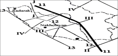 Figure 1 Faults: IV - Arpa - Samur, III - Nehram - Lekatag, 13- South Araz, 4-Sharur-Goyche, 12-Sharur-Ordubad, 11 - Zangezur (T.N. Gangarli).