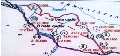 Regional faults are included in the center of the Araz tectonic megazone, which are bordered by Girratag in the northeast, Ashagi Araz (Palmira - Absheron) in the southeast, North Tabriz in the southwest, and Ağrıdag in the west.3 In various periods of history, strong earthquakes have occurred in connection with these faults and resulted in many casualties. In the years 735, 906, 1308, 1406, 1931 in the territory of Armenia, which is the north-eastern border, in the years 1042, 1641, 1721, 1780 and 1786, in and around the city of Tabriz, East Azerbaijan province, in the south and south-west border of Iran, in the west Strong earthquakes occurred in Eastern Anatolia of the Republic of Turkey in 1840, 1976, and 2011. The listed earthquake epicenters are located 100-150 km from the territory of the autonomous republic. The intensity of a part of these earthquakes reached 7-8 points according to the MSK - 64 scale in the territory of the autonomous republic Figure 2.