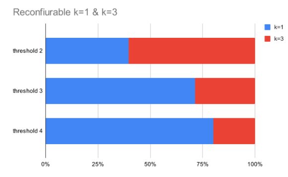 Reconfigurable k=1 & k=3, k=2 & k=5, and k=3 & k=7 adder-based multipliers without and with rounding are implemented. To realize reconfigurable adder-based multipliers, finding an appropriate threshold is indispensable. When the optimal level of accuracy predicted by the kNN error estimator is lower than a threshold, low accuracy mode is selected. Otherwise, high accuracy mode is determined. According to different thresholds, Fig. 4 illustrates average error rates and the number of data categorized into the specific level of accuracy. If the error tolerance of target applications is higher than the mean error of a reconfigurable adder-based multiplier, selecting the threshold with more data at lower levels of accuracy gives more opportunities to relax the computational accuracy, which results in high performance and high energy efficiency.
