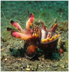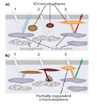 Sepiida is a type of cephalopods which is well known for its ability to alter its colour shown in Figure 1 either apparently disappears into its environment or to create dramatic displays. The patterns and colours seen in cephalopods are formed by different layers of cells stacked collectively including chromatophores, leucophores and iridophores, and it is the amalgamation of certain cells operations of reflecting light and matching patterns at once that allows cephalopods to acquire such a huge array of patterns and colours. These layers are explained as follows: