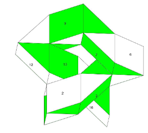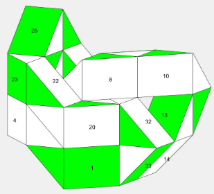Figure 2shows the realization of the first sequence. Its line representation is in Figure 1. The key idea is that the computational cost for searching for a palindromic sequence with 34 blocks is only within 417 attempts, not an unrealistic 434 attempts.Similarly searching for period 2 or period 3 solutions are also within reach. We also did an exhaustive search for period 2 and period 3 Rubik’s Snake trefoil knots but there is no result with 34 or less blocks.