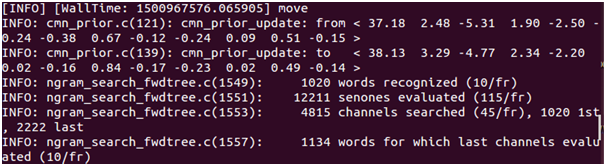 The data cycle from the beginning to the output in the environment has been shown in this figure, the Figure 7 & 8 represented the output of the recognizer Ros node when word move or stop come from the microphone. In this Figure 9 the simulated JACO arm is moving after the word (move) comes from the microphone in the number (1) then stop the moving because the word (stop) comes in the number (2) and still doesn't move in the number (3) at the end in the number (4) the word (move) comes again so that the arm is moving.