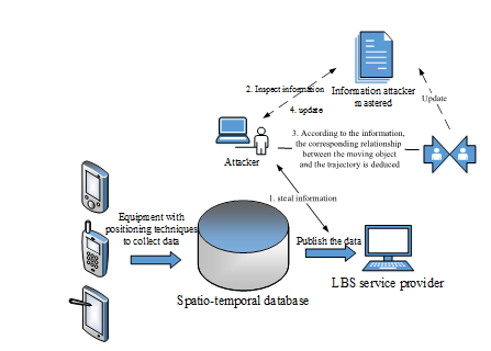 with more comprehensive information to attack again, the moving object will be subject to greater threat to privacy, more likely to lead to the disclosure of the privacy of mobile objects. The effect of privacy protection after optimizing the privacy protection algorithm is valued by the leakage of the targets’ privacy, when they are attacked again by those attackers. At this time, the attackers’ learning ability is not taken into consideration. (As shown in Figure 1)