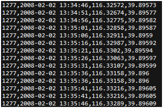 As shown in Figure 3, each line of data represents a spatio-temporal data collected by sampling point, separated by commas, respectively representing taxi ID, sampling data /time, longitude as well as latitude. As the time span involves the multi-day data, the data preprocessing is carried out before testing data. The data set contains partial repeating data, that is, multiple records in the same time, so the data needs to be cleaned before processing, and at the same time the position information data of moving object in the day composes a trajectory, that is, each moving object has seven trajectories (namely, a 7-day moving path is recorded). The APT-PP algorithm is written by Python, and is tested in hardware condition of Intel(R) Core(TM) i7-4610M CPU @ 3.00GHz, 8.00GB memory and Microsoft Windows 10, and the results are shown by MATLAB.