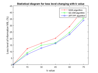 value (anonymity level) are described in Figure 5. Comparing with Figure 4,5 it can be found that, the loss conditions of the algorithm (NWA algorithm and GC-DM algorithm) have almost no difference in the same data set after two experiments, however the algorithm APT-PP has significant optimization in the experiment of loss level of tolerance error of information, and the APT-PP algorithm optimize the presence of tolerable offset