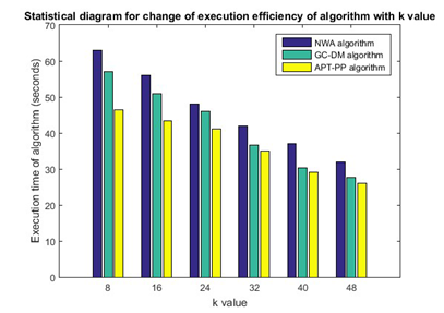 size of privacy protection level and execution efficiency of algorithm. The test for contrast algorithm (NWA algorithm and GC-DM algorithm) and APT-PP algorithm of the paper in T-drive data set, and the conditions of execution time of algorithm changing with