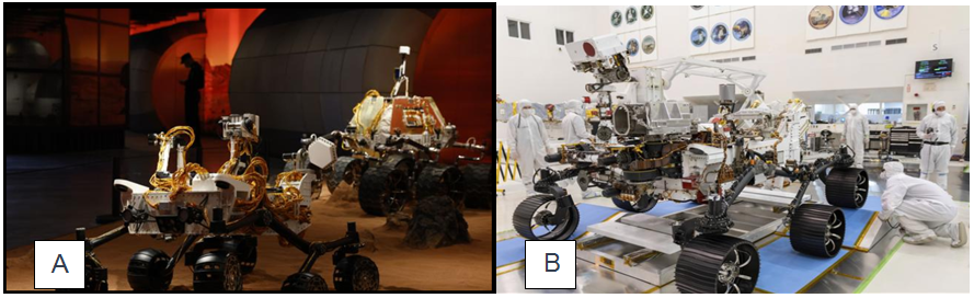 Figure 1 A. China Space Agency Rover vehicle. B. NASA Perseverance Rover vehicle. and emotional development. Both missions in addition to collecting samples and determining if microbial life existed at any time, they will collect data to establish the initial conditions for a future human mission. The initial stages consider the biogeochemical characteristics, but it is necessary to start working on the conditions that would maintain or generate new social relationships and their interactions with new factors such as AI, robotics, and humans. In this case, the two rovers are a reflection of a rationality based on competitiveness and the idea of being the first colonizer of an unknown space and territory. (Source:https://www.lavanguardia.com/ciencia/20200723/482473120688/lanzamiento-mision-china-marte.html#galeria-foto-2)