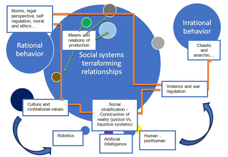 Figure 2 Proposed Model of Exo-social analysis: Social systems terraforming relationships depend on not only the recognition of our history as a civilization within a rational orientation but also interacts with an irrational vision in which a balance prevails in which the resolving forces are commanded by motivations typical of an advanced civilization. We must work on it and not simply repeat the models that we already know.