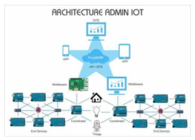 The Admin IoT architecture is based on the principle in a star topology connection, mobile devices via app, website or middleware API, where is all the database information and services available for interconnectivity between them where they are connected. Through the middleware, laptops or microprocessors as the Raspberry Pi are connected to API, they are also connected to the Coordinators, i.e microcontrollers like the Arduino, which are connected to it via USB, thus making communication between them. In turn, the coordinators are connected to the other End Devices via wireless communication such as Wi-Fi, Bluetooth or radio frequency, as with exceed, such communication is made in the topology mesh format. All called for thing, will be plugged to any end device or even the coordinator.