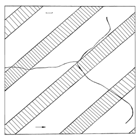 Figure 1 Trajectory of crack propagation in a model of inhomogeneous material; Direction of pipe length, ///// - reinforced areas.8