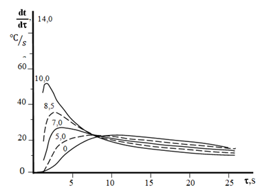 In this case critical tension is virtually equal to that of standard samples. In a work15 single sided speed cooling of samples from 14Г2 steel results in changing of hardness over the thickness from 45-35HRC to 26-28HRC. Figure 2 presents estimated distribution of speed cooling over the thickness of a cooled sample. Such kind of cooling across the cross-section of a sample causes forming of a diverse microstructure, whose hardness is presented in Figure 3. By virtue of sparingly alloy steel of 14Г2 steel type single sided speed cooling provides sufficiently high hardness and subsequently durability in combination with good mechanical cutting on the opposite side.