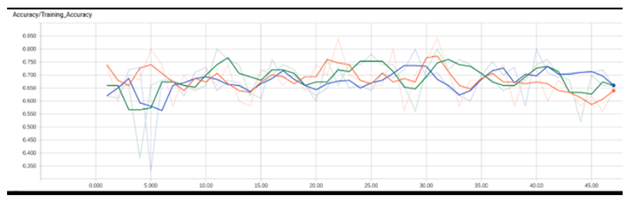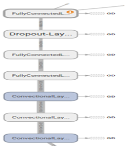 The basic CNN structure that has been used in this article is composed of three convolutional layers and three fully connected layers, a dropout layer and some pooling layers. The ReLu activation function is being used between the layers. The first convolutional layer is built from three on three kernels with 32filters. The second convolutional layer is built from three on three kernels with 64filters. The last convolutional layer is built from five by five kernels with 128filters. In Figure 3 the design is described. The weights initialized with zero mean normal distribution and variance of 0.001, the biases initialized with the constant 0.01. For training and testing, the images were cropped into N smaller images size MxM. This has been done to address the issue described in the last section. Every slice that has a labeled object on it got the true label and the rest got the false label. The data was in a radial coordination system. Lastly, for every true labeled slice, two false label slices were randomly added. Three datasets were trained and tested on the basic CNN structure. Details about them are summarized in Table 2. Training the basic CNN structure for 5000 iterations with a batch size of 128 gave the results in Figure 4. This basic CNN structure only converges into one of the two possible outcomes. The first one is the false system, for every input the output will be false. The other one is the true system, for every input the output will be true. Trying to change the ratio between the false labeled images and the true labeled images didn't yield any different results. These results point out that the CNN couldn't learn the features of the objects. It could be that because of the high SNR the features can't be observed in a single image.