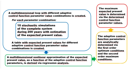 denote the linear constraints in the LP or QP problems. is the probability of transition from oil price state to oil price state in the following period. The SDP problem is defined with a finite horizon, . It is solved via backward recursion. More details concerning this particular type of application are found in Lohmander.4,5 Observe that (1) represents a very general and flexible way to formulate and solve applied stochastic multi period production and logistics problems of many kinds. The true sequential nature of decisions and information is explicitly handled, stochastic market prices and very large numbers of decision variables and constraints may be consistently considered. Furthermore, many other stochastic phenomena may be consistently handled with this approach. Several examples of how different kinds of stochastic disturbances may be included in optimal dynamic decisions are found in Lohmander et al.,5–8 Adaptive control function optimization and typical application. When the number of decision variables is very large and the optimal decisions are dependent on detailed information in a state space of large dimensionality, SDP cannot be applied with reasonable computation time. Consider the following typical application problem: We want to optimize the management of a forest area with many trees. We have one hectare with 1000 trees. The dynamic development of each tree (diameter increment, height increment and so on) is dependent on the properties of the individual tree and the local competition (which is a function of the properties of the neighbour trees within a circle with radius ten meters, surrounding the individual tree). The optimal harvest decisions are price dependent and the price is exogenous and stochastic. We instantly realize that, in order to keep track of the development of each tree, we have to keep track of the properties of every tree. In principle, we could handle this problem via SDP. The number of possible state combinations is however extremely high. For this reason, SDP cannot be used (with reasonable time of computation). Then, optimal control functions for local decisions may be defined and the parameters can be determined via stochastic full system simulation and multidimensional regression analysis (Figure 1). Lohmander5,8 include an approach to determination of all local decisions based on locally relevant state space information within stochastic dynamic and spatially explicit production. The expected present value of all harvests, over time and space, in a forest area, is maximized. Each tree is affected by competition from neighbour trees. The harvest decisions, for each tree, are functions of the price in the stochastic market, the dimensions and qualities of the individual trees and the local competition. The expected present value of the forest, when optimal adaptive decisions are taken, is an increasing function of the level of price risk.