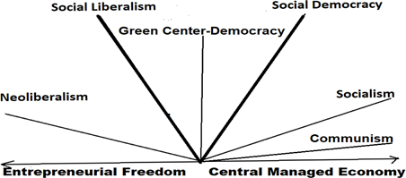 Correction of market-failures requires that reciprocity expands beyond selfishness to economic actions for the common good. Neoliberalism is outdated by Social Liberalism due to negative side-effects, and the Communist experiment in Eastern Europe 1917-91 rejects centralized economic planning as a growth model.24 So, the spectrum for securing the common good ranges today from Social Liberalism to Social Democracy as illustrated in Figure 3, where the X-axis represents “Entrepreneurial Freedom '' versus “Central Managed Economy”. A prototype of Figure 2 is Germany with a coalition across-the-center of Social Liberals (FDP), The Green Party and Social Democrats. Denmark has a similar across-the-center government. A field study related to this project of economic preferences among Danish social liberals confirms the top-priority of common goods as a CO2 Tariff at the level of social liberal voters which is also the recommended intervention towards the greenhouse effect by the economic profession since Pigou25 1920.26