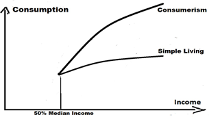 Modern behavioral economics understands economic behavior as determined by group processes rather than by classical individual sovereignty.28 A bottom-up alternative to Consumerism is “Simple Living”29 which is a rational response to the low marginal utility of basal consumption that makes alternatives more and more attractive. Figure 3 illustrates that a majority of consumers dispose of the double of what's needed to satisfy basal physiological and social needs. “Simple Living” is driven by positive motives such as personal development, health, ecology and household economies and the additional recognition that mass consumption is blown-up by marketing. The “Rise of the Creative Class” labels this development30 which is confirmed by a European follow-up study in Denmark.31