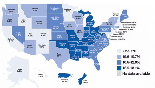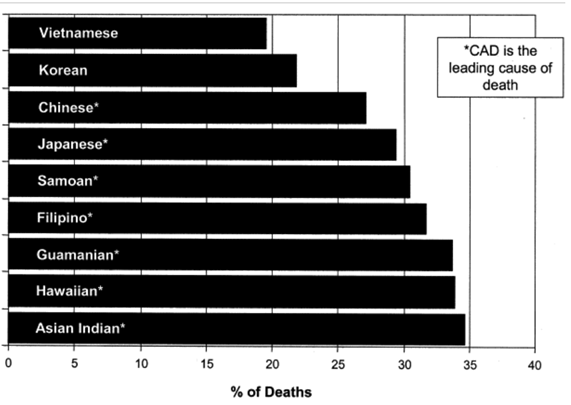 Figure 5 Percentage of deaths in US Asian / Pacific Islander populations due to CAD.13 The image shows the prevalence of CAD in various populations in the US.