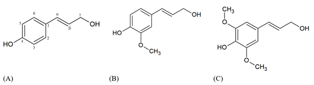 Figure 1 Monolignol species: (A) p-coumaryl alcohol (H unit), (B) coniferyl alcohol (G unit), (C) sinapyl alcohol (S unit).