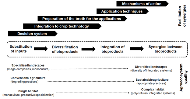 The agroecological transition in the use of bioproducts begins with the substitution of chemical inputs for biological ones, continues with the diversification in the supply and use of different types of bioproducts, at the same time that these are integrated into the management of farming systems, contributing with various agronomic, economic and ecological functions; while, the greatest sustainability in its use is achieved when synergies between bioproducts are promoted (Figure 1).