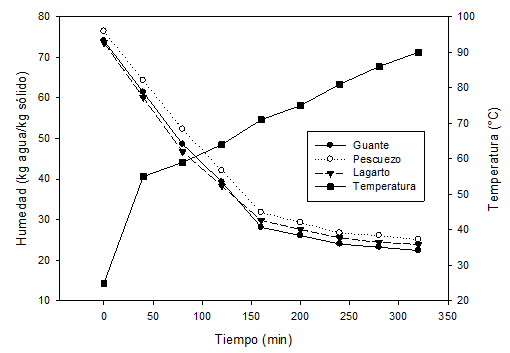 Drying curves for each cut were made, taking into account the operating conditions of the process as the initial moisture of the raw material, temperature, relative humidity, air velocity and final product moisture, among others.6 At the start of the initial weights for each cut taken and the weight loss was monitored during drying every 30 minutes for three cuts, until a final humidity of 25 - 30%. Similarly the increase in temperature was monitored throughout the process, until a maximum temperature of 90°C. Similarly, the results obtained with the yield of each cut was calculated.