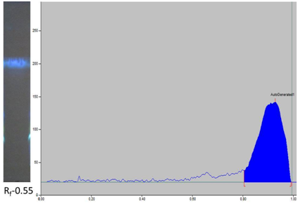 The compound was isolated by column chromatography using chloroform and methanol (9:1) ratio as elute and the purity of the compound was confirmed by HPTLC (Figure 1). A single fluorescent blue spot was visualized under UV Chamber at 254 nm with Rf of 0.55.