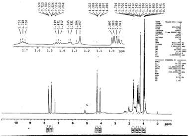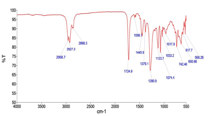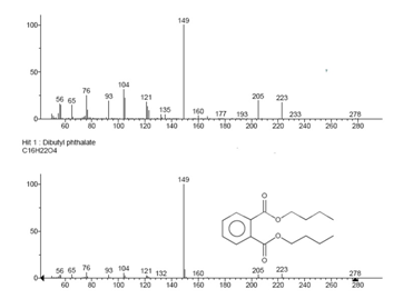 Dibutyl phthalate (C16H22O4), pale yellow oily compound, yield: 500 μl (0.01%). Boiling point: 340-343°C, UV (λmax): in chloroform 231 (Figure 2). FT-IR (cm-1): 1724.9 (ester carbonyl), 1280.9 and 1074.4 (-C-O-stretching), 742.46 (ortho disubstitution) (Figure 3). 1H NMR (δ ppm): CDCl3-d6, 400 MHz, 7.724 (2H, dd), 7.535 (2H, dd), 4.322 (4H, t, -O-CH2), 1.736-1.449 (4H, m, -CH2), 1.345-1.284 (4H, m, -CH2), 0.919 (6H, t, -CH3) (Figure 4). 13C NMR (δ ppm): CDCl3-d6, 400 MHz, 167.71 (C=O), 132.54 (C), 130.90, 128.85 (CH, Aromatic), 65.85 (-O-CH2), 30.59, 19.17 (-CH2), 13.82 (-CH3) (Figure 5). Mass (m/z): 278 (M+ peak) (Figure 6).