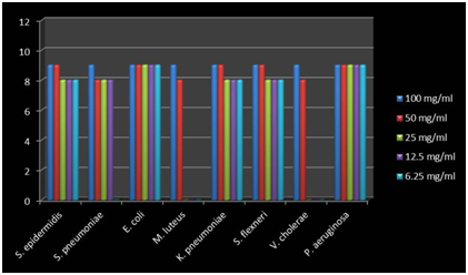 Dibutyl phthalate (Figure 7) showed 9 mm zone of inhibition against Staphylococcus epidermidis, Strephtococcus pneumoniae, Escherichia coli, Micrococcus luteus, Klebsiella pneumoniae, Shigella flexneri, Vibrio cholerae and P. aeruginosa at the concentration of 100 mg ml-1. Similar zone of inhibition recorded at all the concentrations of E. coli and Pseudomonas aeruginosa. Eight mm zone of inhibition was recorded against Strephtococcus pneumoniae at 50, 25 and 12.5 mg ml-1. Staphylococcus epidermidis, Klebsiella pneumoniae and Shigella flexneri also showed 8 mm zone of inhibition at 25, 12.5 and 6.25 mg ml-1 concentrations.