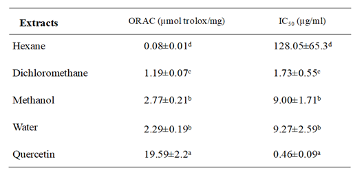 Table 1 indicated that methanol and water extracts showed the highest antioxidant activity, with ORAC values of 2.77±0.21 and 2.29±0.19µmol TE/mg respectively, followed by dichloromethane extract (1.19±0.07 µmol TE/mg). While activity of hexane extract was less significant. Regarding ex vivo antioxidant ability results presented in Table 1 indicated that dichloromethane extract has powerfully antioxidant activity and inhibited the tBH-induced oxidation of DCFH with an IC50 value equal to 1.73±0.55 µg/ml. Moreover, methanol and water extracts displayed similar activity (IC50 value was about 9 µg/ml). Although, hexane extract showed less oxidation inhibition (IC50 value = 128 µg/ml). These findings demonstrated that S. mollis extracts mainly which are extracted with higher polarity possess an important antioxidant capacity.