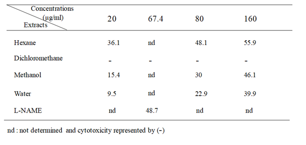 Anti-inflammatory activity was evaluated using LPS-stimulated RAW 264.7 macrophages. Stimulation of RAW 264.7 macrophages by LPS induces iNOS (inducible NO synthase) and overproduction of NO. Results presented in Table 2 showed that hexane extract exhibited appreciable inhibitory effect on LPS-induced NO secretion with 55.9 % at 160µg/ml, followed by methanol and water extracts which inhibited NO release by 46.1 and 39.9%, respectively. However, dichloromethane extract showed cytotoxcicity at doses ranging from 2.5 to 160 µg/ml (data not shown). Comparatively, the L-NAME, used as positive control inhibited NO release by 48.7 % at 250.0 µM (67.4µg/ml).