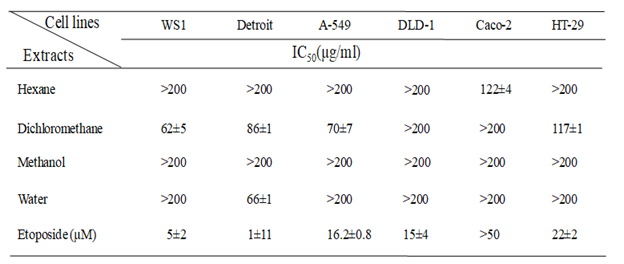 Exponentially growing cells were plated at a density of 5×103 cells per well in 96-well microplates (Costar, Corning Inc.) in 100 µl of culture medium and were allowed to adhere for 16h before treatment. Then, 100 µl of increasing concentrations of extract dissolved in the appropriate solvent (DMSO) were added. The final concentration of solvent in the culture medium was maintained at 0.5% (v/v) to avoid solvent toxicity. The cells were incubated for 48h in the absence or in the presence of extract. Cytotoxicity was assessed using the resazurin reduction test as described by O’Brien et al. (2000). Fluorescence was measured on an automated 96-well Fluoroskan Ascent FlTM plate reader (Labsystems) using an excitation wavelength of 530nm and an emission wavelength of 590nm. Cytotoxicity was expressed as the concentration of extract inhibiting cell growth by 50% (IC50).