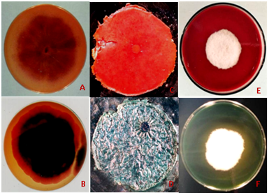Future Perspectives: Based on the investigations, it is clear that within the microbial diversity, fungi are much important for bio-degradation process of hazardous dyes and effluents. Further, investigations on mycoremediation have also been shown an inhibition in decolourizing fungal strain compared to their growth in a normal medium (Figure 1E & 1F) that might be a reason to get a lower percentage of dye degradation/decolourization after using of potential fungal strains for the same. Inhibition in fungal growth during the dye degradation/decolourization against some specific dye compounds clearly indicates the inefficiency of used fungal strain, might be due to toxicity of dye that suppresses the production of enzymes as well as mycelial growth. Applications of molecular tools and technology to identify genes encoding enzymes in potential fungal strains may be helpful in synthetic dye degradation.48 With the help of genetic engineering, genetically modified strains the efficiency of dye degradation/decolurization through fungi may be enhance. Connection among the researchers and policy makers should be come onto the same forum to find out a cheap and environmentally safe large scale treatment process for the industrial effluents. Promotion and set up of interdisciplinary research including chemistry, biochemical and environmental engineering along with microbiology may have success for a permanent biological dye effluent treatment process on a commercial scale, to save and sustain the natural environment from toxic wastes. Proper degradation/decolourization of coloured wastewater from textile industries is major environmental concern. Amongst different chemical, physical and biological treatment methods, the biotechnological approaches based on fungi, are the most effective and environmental friendly methods. Optimization of the culture media in carbon sources or nutrients and mediators molecules is very important to obtain a good output of pollutants degradations.