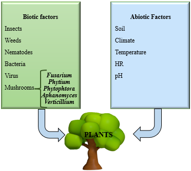 By 2050, the world population is expected to reach approximately 9.1 billion people, therefore, it is estimated that agricultural food production needs to be increased by around 70%.6,10 Likewise, the production of grains is of great importance in world food, but problems such as global warming, environmental pollution and population explosion have repercussions on the productivity of plants, causing both biotic and abiotic stress and resulting in yield losses. Biotic stressors involve fungi, bacteria, viruses, nematodes, weeds, and insects that cause yield losses of up to 31-42%. Among them, phytopathogens of fungal origin are one of the most important since they limit crop production throughout the world,10 and the search for methods that lead to increased agricultural productivity has led to the increase in populations of other organisms (insects, bacteria, and viruses) that limit crop yields. Soil phytopathogens are of great importance because they affect a wide spectrum of hosts. The disease-causing species mainly belong to the genera: Fusarium, Pythium, Phytophthora, Rizoctonia, Aphanomyces and Verticilium,13 (Figure 1), for which it is considered of interest to find alternatives for the control of disease-causing agents that are framed in sustainable agriculture. At present, the use of non-aggressive alternative methods for the environment has gained a great boom, being the BC one of the most promising and it is a substantial component in the initiatives of sustainable agriculture of several institutions and organizations.11,14–16