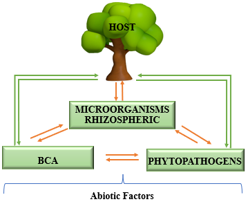 For the use of BC in soil diseases, there are recognition mechanisms and interactions between the BCA, the host plant, the phytopathogen and the microorganisms of the rhizosphere that are subject to variations in different periods of time (rain, drought, concentrations of salts, pH, among others), so knowing the ecology of the BCA is important to understand the relationship between antagonists and the components of the rhizosphere, this being of great importance for the implementation of the biocontroller (Figure 2).