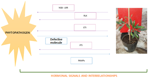 Microbial colonization in plants is regulated by hormonal signals and intercommunications. The plant defense system recognizes molecular patterns emitted by the pathogen (PAMPs: Pathogen Associated Molecular Patterns) and emits its defense PTI (PAMP-triggered immunity), so that the pathogen, to evade the PTI, secretes defective molecules which are overcome by plants resistant and emits a greater defense, which can lead to cell death or programmed tissue necrosis (Effector Triggered Immunity or ETI). They also have extracellular receptors on the membranes, such as RLK (receptor like kinase) that recognize PAMPs, and intracellular receptors such as NBS – LRR (Nucleotide-binding siteleucine-rich repeats) that recognize effectors. Among the plant hormones involved in the defense of plants against the attack of phytopathogens are salicylic acid (SA), which acts against bio or hemibiotropic organisms, while jasmonic acid (JA) and ethylene (ET) they are activated against necrotrophic microorganisms, with SA and JA being mutually antagonistic (Figure 5). The opposite occurs in the relationship biocontrollers and the host that is not well defined, such is the case of Trichoderma. Where microorganisms obtain sucrose from plants in exchange for having the ability to promote plant growth and protect it from pathogens. A protein, Tsp1, that acts as an effector and is negatively regulated by T. virens after 96 h in contact with the root was recently detected.27