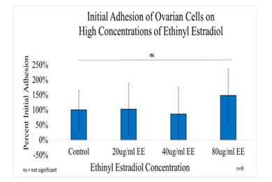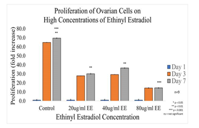 Effect of high concentrations of ethinyl estradiol in ovarian cell adhesion and proliferation in 2D culture. Initial adhesion of ovarian cells did not have a significant impact on the addition of Ethinyl Estradiol, no apparent trend was observed as the concentration of EE was increased. The proliferation of ovarian cells decreased dramatically with the addition of Ethinyl Estradiol, a statistical significance of at least p<0.01 was observed on Day 7. The cells appeared round after 1-hour incubation, slightly spindle as they proliferated. Cell morphology was altered from spindle to circular when exposed to Ethinyl Estradiol. Ovarian cells were noticeably larger and had lost adhesion to neighboring cells when exposed to EE.