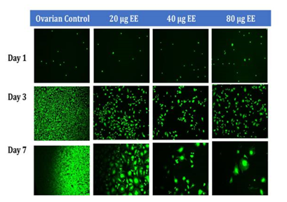 Ovarian Cell Adhesion and Proliferation in 2D Culture. Initial adhesion of CHO cells was calculated using data from a microplate reader, it was observed to increase proportionally as the concentration of cells increased by 10,000 cells, up to 40,000 cells. However, when the density of cells was increased to 50,000, the adhesion fell dramatically. Proliferations of CHO cells were only observed to increase at 10,000 cells per well on Day 3 and Day 7. A reduction in cells was observed on Day 3 for densities of 20,000 and higher. However, a slight increase was observed at Day 7 for 20,000, 30,000, and 40,000; but it continued to decline at 50,000 cells. The morphology of the cells did not change much with time, they appeared as single spheres on Day 1 and rounded on Day 3, direct interfacial contact along membranes was visible by Day 7. The experiments at high concentrations of EE were performed at 10,000 cell density, however, it was decreased to 5,000 cells per well for the remaining experiments of the study to be consistent with the number of breast cells being used for the parallel experiments (Figure 6).