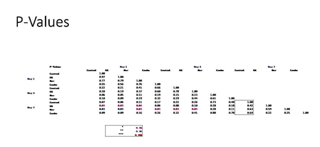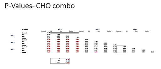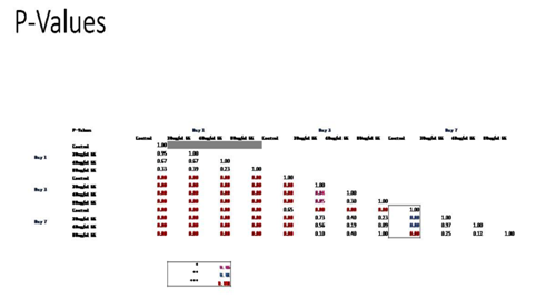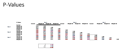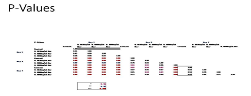 Figure 2D P-Values of Ovarian Cells with Levonorgestrel on 10µg/ml Collagen Matrices: P-Value table indicating significance of experiment results.