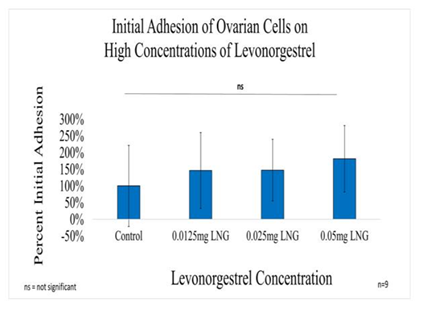 Figure 2A Initial Adhesion of Ovarian Cells with LNG on 10µg/ml Collagen Matrices: Initial adhesion of ovarian cells did not have a significant impact with the addition of Levonorgestrel, an increased adhesion rate trend was observed as the concentration of LNG was increased.