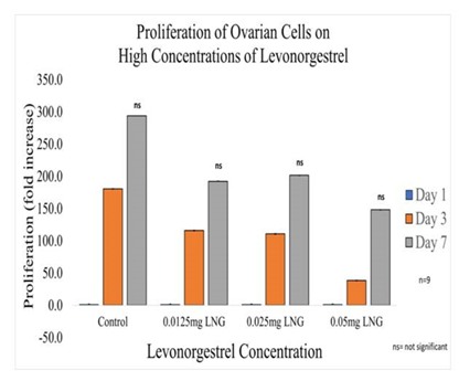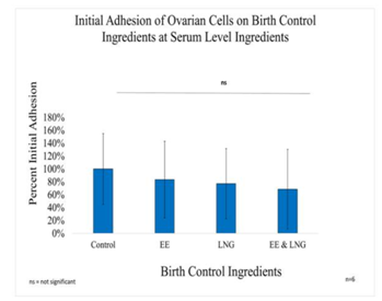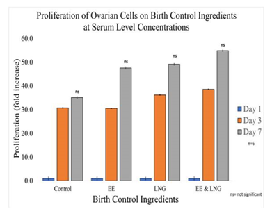 In general, it was observed Ovarian cells have a slight decrease in initial adhesion when treated with birth control ingredients at serum level concentrations; 17% for Ethinyl Estradiol, 23% for Levonorgestrel, and 31% when both ingredients were combined. However, there was no statistical significance in the results. The proliferation of ovarian cells in the presence of Levonorgestrel 3.04 ng/mL and Ethinyl Estradiol 600 pg/mL trended higher than cells that were not treated. Although there was no statistical significance between the control and each condition by Day 7, the following was observed: 35% increase in proliferation when the cells are treated with 600pg of Ethinyl Estradiol, 40% increase in proliferation when treated with Levonorgestrel 3.04 ng/ml, an 56% increase of proliferation when treated with both Levonorgestrel 3.04ng/mL and Ethinyl Estradiol 600pg/mL. Nonetheless, the statistical significance of p<0.001 was observed between the control and each condition from Day 0 to Day 3 and Day 0 to Day 7, but not between Day 3 and Day 7 except for the comparison between EE and the combination (LNG & EE); the experiment was repeated n=6 times.