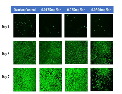 In general, the initial adhesion of ovarian (CHO) cells did not have a significant impact on the addition of Levonorgestrel. Proliferation did not imply statistical significance decreasing by 50% with the addition of 0.05mg/ml LNG, by 31% with the addition of 0.025mg/ml LNG, and by 35% with the addition of 0.0125mg/ml LNG. The morphology of the ovarian cells was visibly altered by Day 3 at the highest concentration of 0.05mg/ml LNG, the cells started to lose their roundness and became a bit elongated and much larger. By Day 7 the morphological changes were even more visible and seemed notably larger.