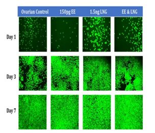 Effect of levonorgestrel and ethinyl estradiol at equivalent blood level concentrations in ovarian cell adhesion and proliferation in 2D culture. Initial adhesion of ovarian cells did not have a significant impact with the addition of birth control ingredients whether they were added individually or as a mixture, a decreasing adhesion rate trend was observed with the introduction of the ingredients. The proliferation of ovarian cells increased with the addition of birth control ingredients whether they were added individually or as a mixture, no statistical significance was observed on Day 7. The cells appeared round after 1-hour incubation, slightly spindle as they proliferated. Cell morphology was not visibly altered when exposed to equivalent blood level concentrations of birth control ingredients whether individually or in combination. A few ovarian cells were visibly larger on Day 3, when exposed individually to EE and LNG. Most cells appeared to have a polygonal shape by Day 3 when exposed to a combination of EE and LNG. Our results are consistent with Fauvet et al.32
