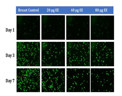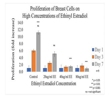 Initial adhesion of breast cells did not have a significant impact with the addition of Ethinyl Estradiol, adhesion rate was similar to the control at 80µg/ml but increased at 20µg/ml and 40µg/ml. The proliferation of breast cells decreased dramatically with the addition of Ethinyl Estradiol, a statistical significance of at p<0.001 was observed on Day 7 at the highest concentrations. The cells appeared round after 1-hour incubation and consistently elongated as they proliferated. Cell morphology was altered from elongated to spindle-like when exposed to Ethinyl Estradiol. Breast cells were noticeably smaller in size and polygonal in shape, the loss of adhesion to neighboring cells was evident when exposed to EE. Our results are consistent with the use of high-dose estrogens in the treatment of advanced breast cancer.31