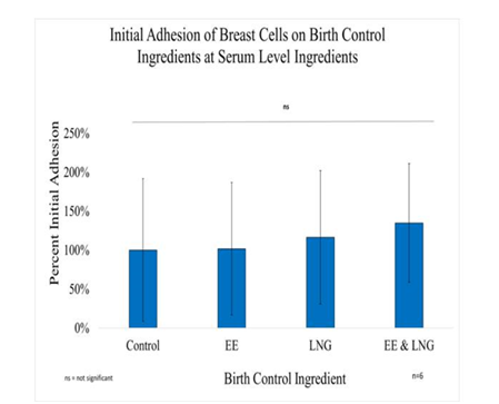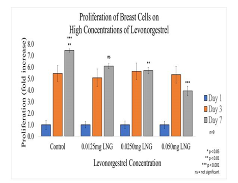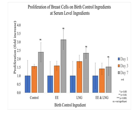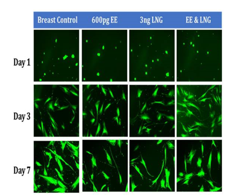 In general, it was observed Breast cells have a slight increase in initial adhesion when treated with birth control ingredients at serum level concentrations; 2% for Ethinyl Estradiol, 16% for Levonorgestrel, and 35% when both ingredients were combined. However, there was no statistical significance in the results. The proliferation of breast cells in the presence of Ethinyl Estradiol 600pg/mL trended higher than cells that were not treated, whereas with Levonorgestrel 3.04ng/mL and when combining both ingredients trended lower than cells that were not treated. Although there was no statistical significance between the control and each condition by Day 7, the following was observed: 29% increase in proliferation when the cells are treated with 600pg of Ethinyl Estradiol, 4% decrease in proliferation when treated with Levonorgestrel 3.04 ng/ml, an 37.5% decrease of proliferation when treated with both Levonorgestrel 3.04 ng/mL and Ethinyl Estradiol 600pg/mL. Nonetheless, the statistical significance of p<0.05 was observed between Day 0 to Day 7 when comparing Control and EE, Control and LNG, EE and EE, EE and LNG, the Combination and LNG. The statistical significance of p<0.05 was also observed from Day 3 to Day 7 between the control and LNG and between EE and LNG; the experiment was repeated n=6 times.