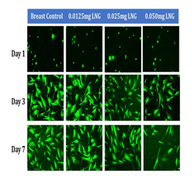 In general, the initial adhesion of breast cells did not have a significant impact with the addition of levonorgestrel; however, the proliferation of breast cells did show a statistical significance of at least p<0.01 for the two higher concentrations. Overall, the greatest reduction in proliferation on Day 7 when compared to the control was observed at 47% for 0.05mg/ml LNG, followed by 23% reduction for 0.025mg/ml LNG, and 18% reduction for 0.0125mg/ml LNG. The morphology of the breast cells was slightly altered by Day 3, the cells started to look less elongated and appeared smaller at 0.025mg/ml LNG. By day 7, the cells treated with Levonorgestrel at the highest concentration of 0.05mg/ml had completely lost adhesion to neighboring cells and morphed into a distorted shape.