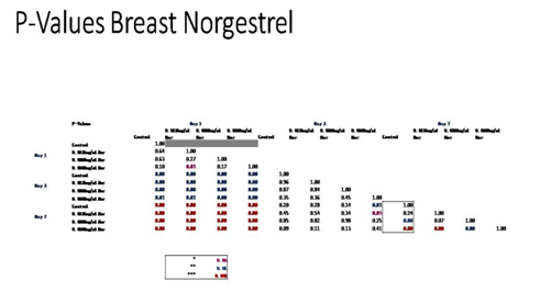 Figure 5D P-Values of Breast Cells with Levonorgestrel on 10µg/ml Collagen Matrices: P-Value table indicating significance of experiment results.