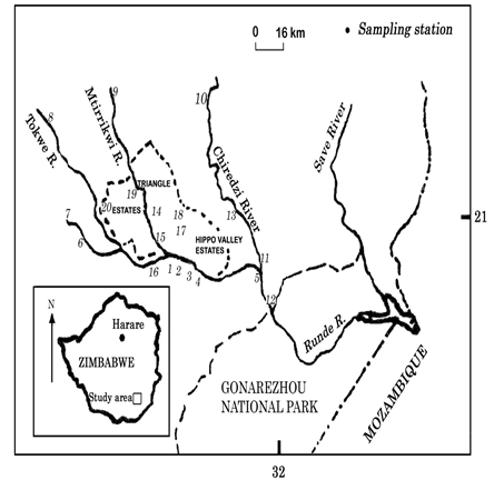 Benthic samples were taken in the dry season August 2003 and wet season of April 2004 in the upstream of Chiredzi, Mtirikwi and Tokwe Rivers at Hippo Valley and Triangle Sugar Estates (Figure 2), using a SASS4 protocol for water quality described by Gratwicke,16 Dallls17 and Vos et al.4 Collections of the invertebrates were made using a standardized net. The collector moves upstream pushing and rubbing stones with his feet, attempting to disturb the substrate to a depth of about 10 cm, the net being held just downstream, to catch animals carried away by the current.16 Sampling usually took about three minutes, and this is in a series of short, thirty second bursts. The invertebrates were then tipped into a shallow tray where they are separated from debris and identified down to family level. The presence or absence of a family is noted on the SASS sheet which has sensitivity ratings on it.17 When the score of each family present is added up, it gives a total which is called the sample score.17 When this is divided by the number of families present, an average score per taxon (ASPT) is given.17 The ASPT is, therefore, a measure of the average sensitivity of all the organisms present to organic pollution.16,17 The limitations and the problems involved in using a grab of this type have been noted by and Karr.19 Upon retrieval all accumulated material from the samplers were collected and preserved. The collected organisms were identified at the family level and genus. List of families collected from the rivers was compiled. Live sorting and preliminary counting of readily identified taxa were carried out in the field, before preserving the sorted invertebrates in 70 % isopropryl alcohol for laboratory identifications and checks using keys of Thirion, Appleton,11 Braack21and Picker et al.20
