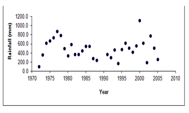 Figure 5 Long-term annual rainfall record for the Gonarezhou National Park (n=31, CV=50 %) (Source: Department of Meteorological Services, Harare).